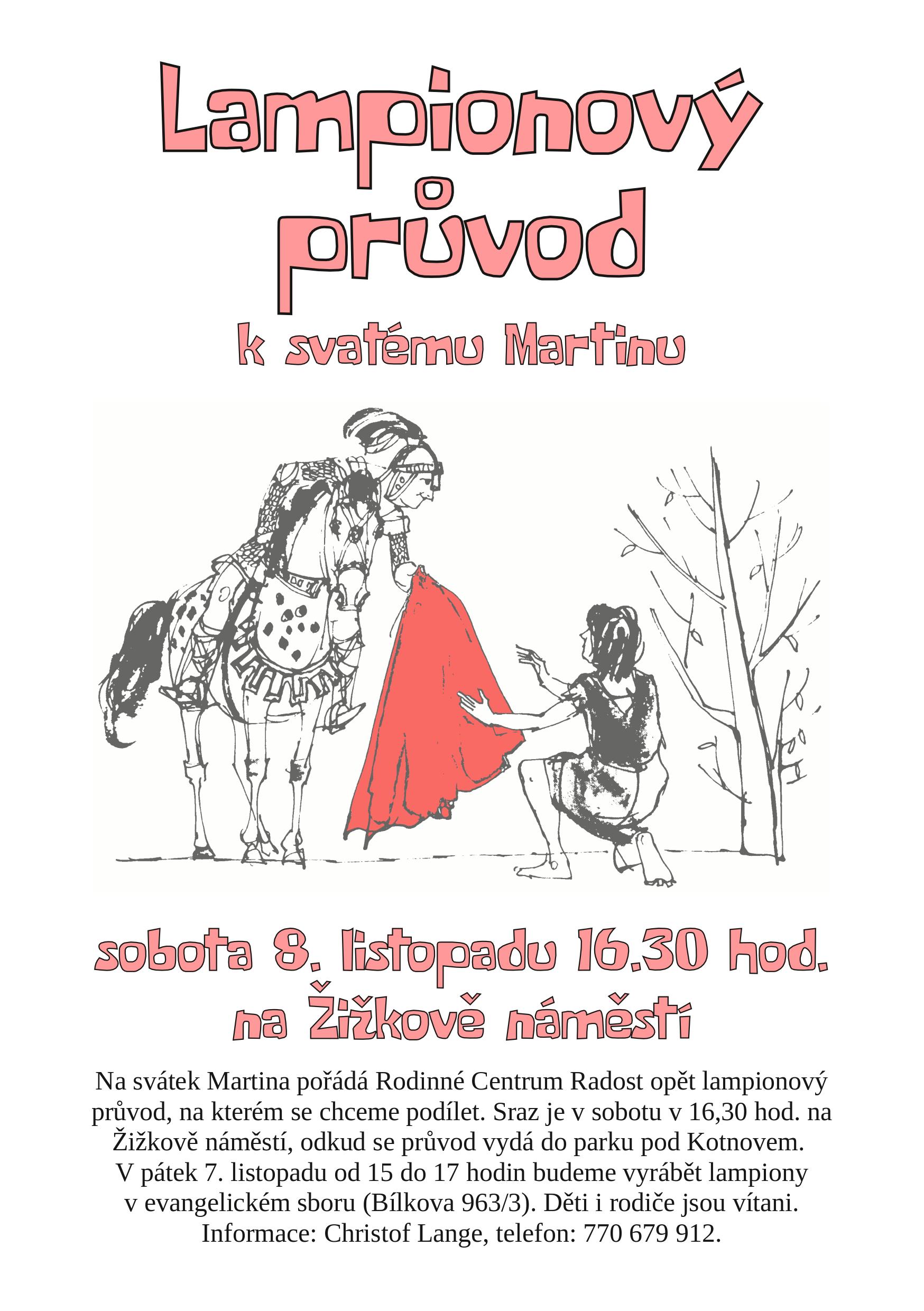 Na svátek Martina pořádá Rodinné Centrum Radost opět lampionový průvod, na kterém se chceme podílet. Sraz je v sobotu 8. listopadu v 16,30 hod. na Žižkově náměstí, odkud se průvod vydá do parku pod Kotnovem. V pátek 7. listopadu od 15 do 17 hodin budeme vyrábět lampiony v evangelickém sboru (Bílkova 963/3). Děti i rodiče jsou vítani. Pokud se chcete připojit zavolejte 770 679 912.